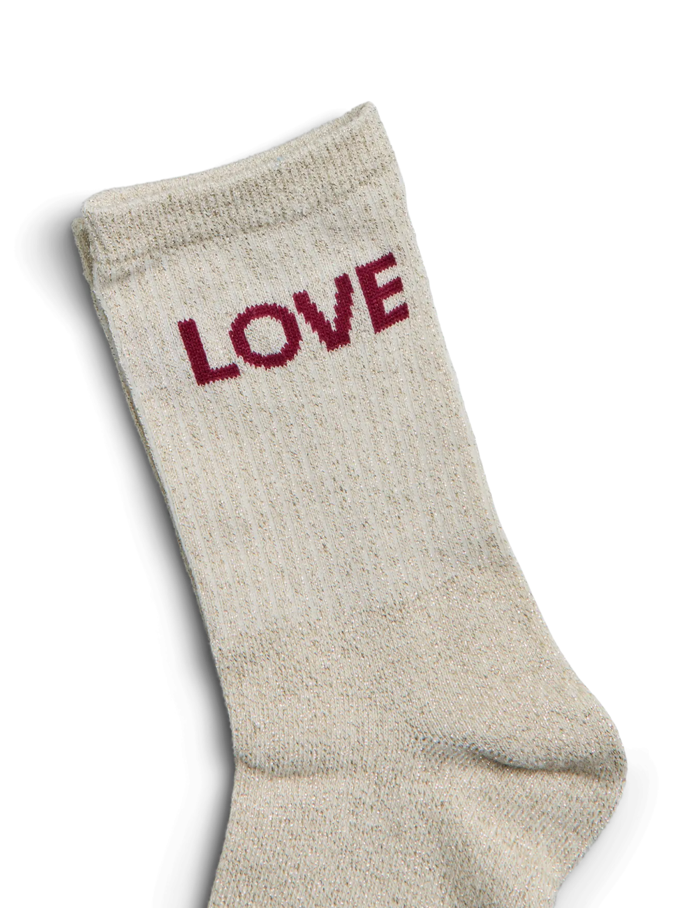 Calcetín crema con lurex dorado y letras LOVE en burdeos