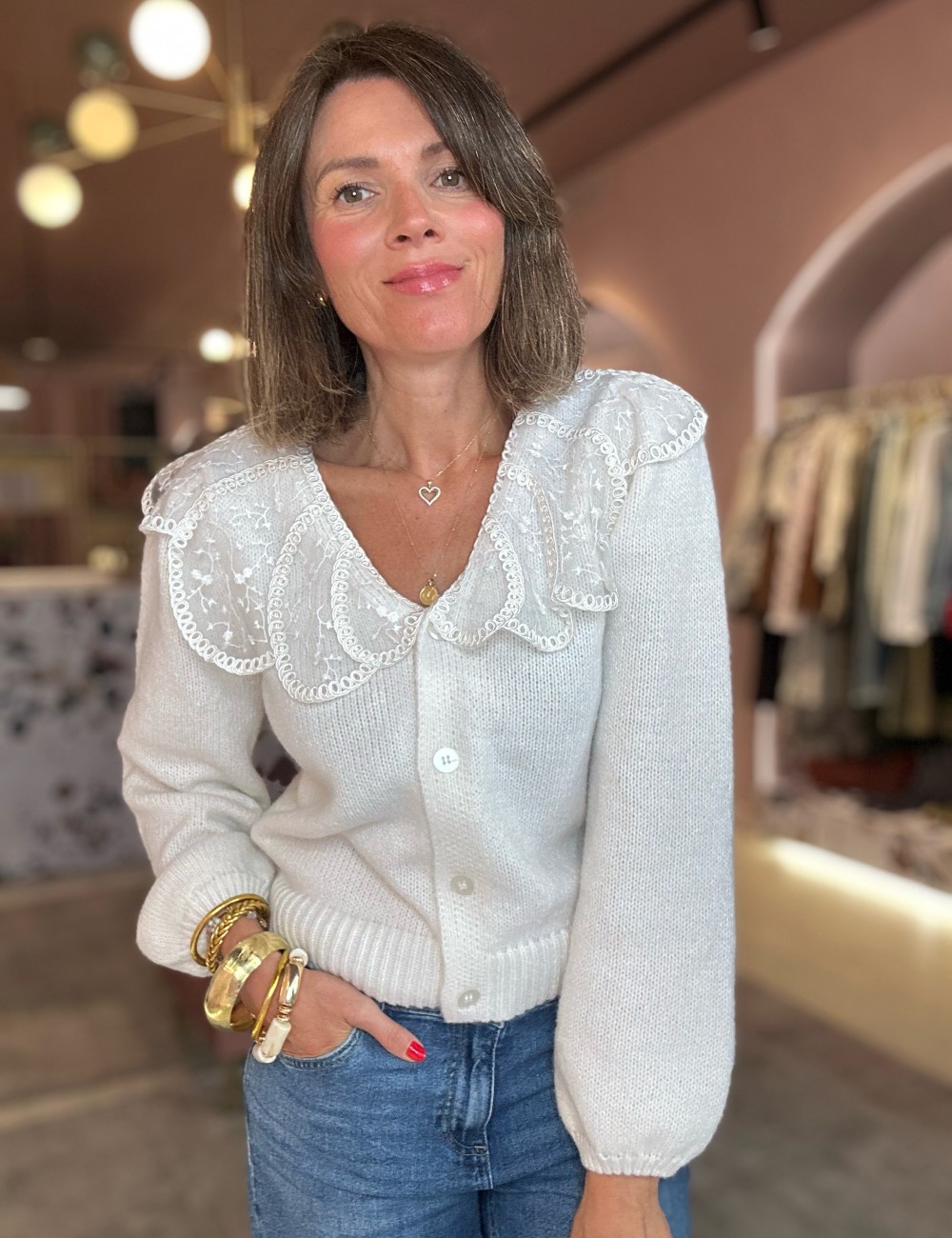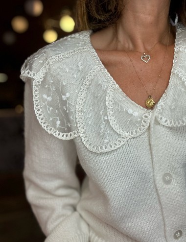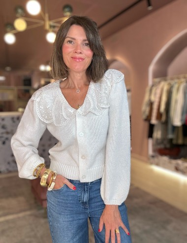 Chaqueta de punto blanco roto con cuello de organza bordado