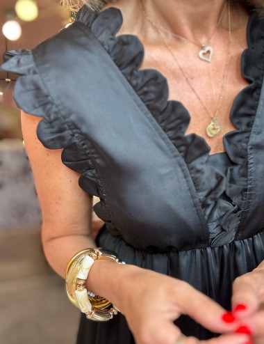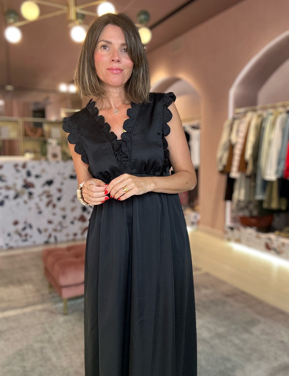 Vestido largo negro con detalle de tirantes y escote en pico acabado en ondas